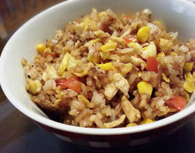 (1) 起锅热油后,先炒蛋 (2) 依序放入彩椒丶洋葱,加半匙盐巴翻炒 (3) 加入隔夜饭翻炒后加适量酱油添色 (4)最后加适量玉米粒翻炒一下