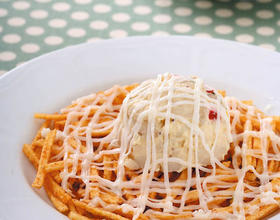 在铺好的薯条饼干上,放置一球德式洋芋沙拉。