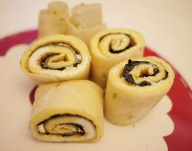 取出煎好的蛋饼皮,放上两片夹心海苔