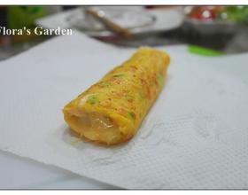 玉子烧锅(炒菜锅也可以)抹少许油,倒入3.少许的蛋液、摊平,待底部凝固表面尚未全凝固时,放2.将蛋皮卷起来(担心蛋凝固来不及卷,可以将锅子离火慢慢卷)卷完后,再倒其他蛋液、直到全部卷完。