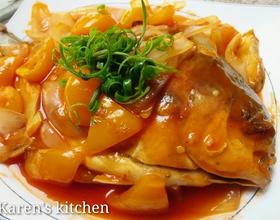 热油洋葱和红椒爆香,加入调味料慢火炒香,再加入水煮滚,放入鱼煮约1分钟,盛出上桌。