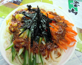 - 5. 于面条上方,摆上红萝卜丝+小黄瓜丝+玉米粒+海苔丝+麻辣酱汁(依喜好淋上适量酱汁) , 拌匀即可食用.