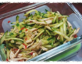 - 3. 小黄瓜刨粗丝,取1/3鸡胸肉丝,2大匙打抛酱抓拌均匀。