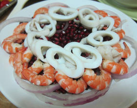 墨鱼去除内部及薄膜后、和虾一起放进滚水汆烫(可加点盐),取出后放凉,墨鱼切圈、虾剥壳备用。