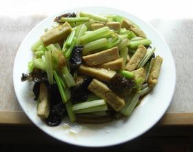 留底油、放入葱姜末煸香、放入芹菜木耳快炒,再放入豆腐、盐、香油、料酒、白糖、味精炒匀。