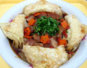 高丽菜盅里装卤好的猪肉、红萝卜,再把碎的小片高丽菜放最上层。