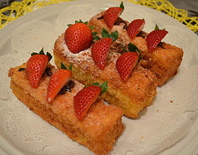 在炸好的吐司条上撤上少许糖粉和放上切好的草莓。