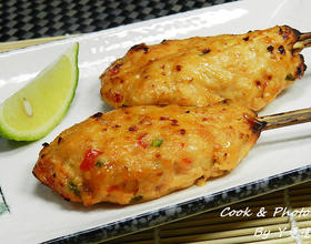 将鸡肉平均分配成两球,塑形后固定在竹籤上,烤箱160度烤20分钟,或是气炸锅120度10分,200度5分钟
