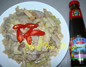 再放入[[李锦记旧庄特级蚝油]]及水闷煮到水收干即可, 有吃辣的朋友可以在爆香蒜片时放入,不吃辣的朋友可以汁收干后再放入