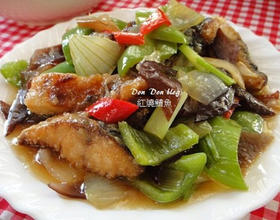 锅中留馀油,炒香葱段.姜片及辣椒,接着再下青椒.木耳.洋葱拌炒