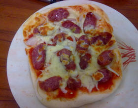 - 4. 将面团分切成四份面团或是按照自己要的分的更小份也可,在台面上洒上少许手粉,将面团桿平,用叉子在面团表面叉个几下,再将面皮移至烤盘内,放上番茄酱汁跟自己喜欢的配料送入烤箱烘烤到表面上色即可。