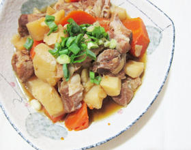 - 1. 准备好所有食材:洋葱切丝、五花肉切块、马铃薯与红萝卜削皮滚刀。