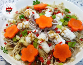 - 3. 依序铺上一层金针菇和乌贼卷,呈放射状排列。