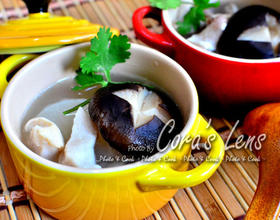 内锅放入2000cc的水煮开,放入"烫好的萝卜"与"生香菇",再加上一匙的鸡粉,慢慢的熬煮。