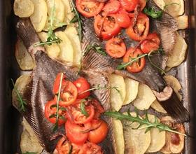 取出烤好的马铃薯,将鱼两面涂上薄薄的橄榄油,洒上盐及胡椒,放入马铃薯上,再铺上切片的番茄跟切成细条的鳀鱼(切好的番茄可以跟鳀鱼先拌一下入味),放入烤箱续烤20分钟即可.