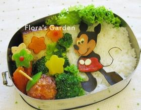 先用纸画出米奇的画像,再依下列食材剪切出形状后组合。 全身、尾巴、黑眼珠、鼻、嘴→卤海带。 脸→素火腿。 眼白、白点→起司。 裤子→红椒用小烤箱烤过去皮。