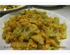 锅中倒入适量的油,放入咸蛋黄炒至煳化再加入南瓜泥炒出香气,再加入姜末、蒜末炒香加入葱末最后加入白花椰菜拌炒均匀即可。
