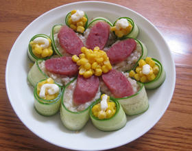 - 4. 等候微波的同时,将小黄瓜片弯曲排列在盘上成花朵状 (每片小黄瓜在花朵中心要互相交叠,放入饭时才不容易散开)