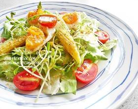 将调好的酱汁适量的淋在沙拉食材上就大功告成喽! 食用前再拌一下即可。 - 3.