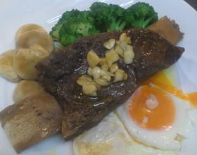 食材蛋,将油倒入锅中,煎到半生熟(蛋白熟蛋黄没熟),洒点海盐调味