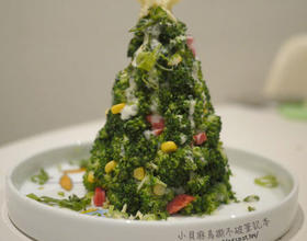 (做好的大小大概是15cm 高) - 10. 星星的部份我是直接用起司球捏成的, 加上玉米粒跟小热狗, 淋上一点沙拉酱就完成了应景的花椰菜圣诞树!