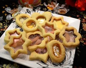 - 10. 把烤盘取出,在饼缕空的位置放上适量的果汁糖碎。(果汁糖可放满一点,烤出来的玻璃效果会更美)