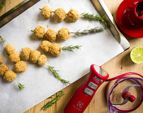- 3. 启动机器将所有食材均匀混合,捏成一个个球状,接着用竹籤串起来。