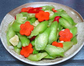 再把菜梗切片状+红萝卜片。