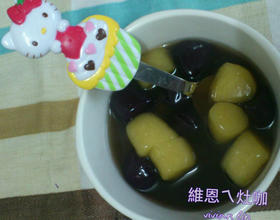 - 7. 煮一锅水来煮芋圆, 水煮滚之后才能下芋圆 ,煮至浮起 捞起之后趁热依个人喜好加入糖拌匀.一定要热的时候加糖喔 这样糖才会全部融化.另煮一锅姜汁糖水,再加入熟地瓜圆即可。