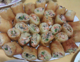 - 9. 再轻轻卷起圆桶状,最后涂抹粉煳将春卷黏住