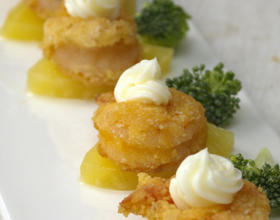 摆盘时依序放上凤梨片、虾球、点缀上美乃滋即可完成喔!