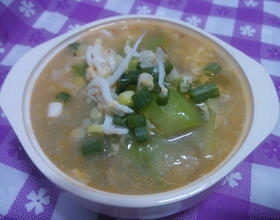 先用汤瓢轻轻搅拌均匀,再适量的盐与少许的白胡椒粉,搅拌均匀后,先将蛋汁淋下去,最后洒上葱花滴上几滴香油即可上桌。