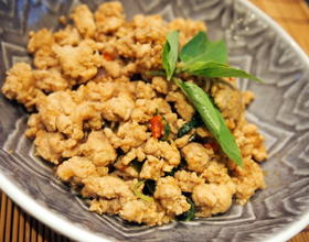 猪肉炒至九成熟时,才加入罗勒叶,炒至软身便可上碟.最后加入调味即可.