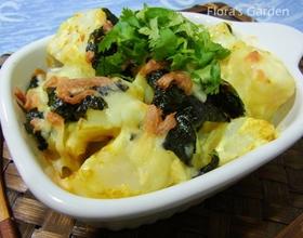 放焗烤盅、将元本山朝鲜海苔用手撕开堆叠在每一块马铃薯旁。