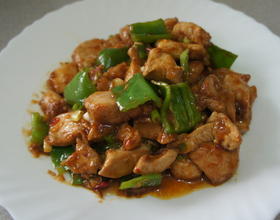 原锅爆香蒜末.姜末.豆瓣酱.沿锅边呛入酱油拌炒一下.加入糖.鸡丁.青椒炒到肌肉全熟.起锅前加入少量太白粉水勾芡即可.