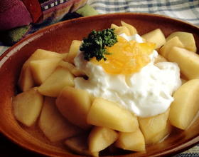 取耐热盘,把苹果切成一口大小银杏叶型,然加加肉桂粉和砂糖、乳玛琳。