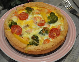 - 5. 将材料1蔬菜洗净,青花菜切小朵,稍加点油汆烫一下。番茄切半,黄甜椒切条,鲑鱼切粒。