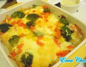 锅内油热,下洋葱碎,炒出香味,将面粉过筛下入锅内拌炒下牛奶,将酱拌匀,调味完成,下绿花椰菜,红椒,黄椒,入烤盘洒起司丝