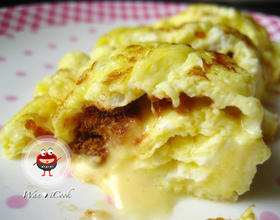 颗蛋加少许鲜奶,打散混合成蛋汁搅拌均匀。不沾锅中放一点奶油加热,倒入蛋汁。用中火烧热油锅,倒进蛋汁,用筷子快速地搅拌蛋汁。见蛋汁很快煮成蛋花。趁蛋汁还未煮熟凝结时,把油锅旋转,让蛋汁铺平成一圆饼。