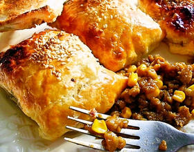 - 5. 将奶油涂在酥皮上,放上炒好的咖哩绞肉、肉桂蜜苹果(水要沥干)起司片。
