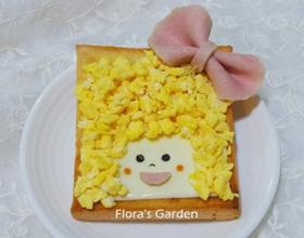海苔用剪刀剪出眼睛和嘴巴贴在起司上,番茄酱用牙籤点在脸颊当腮红。