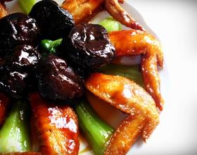 再把调味料放入一起拌匀,起锅前再把香菇.鸡翅放入炒1至收汁即可,