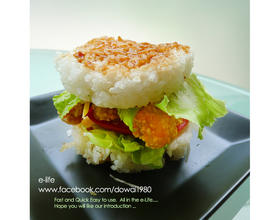 将番茄、生菜、鱼柳、美乃滋夹入烤过的米饭中,美味的米汉堡就完成啰!