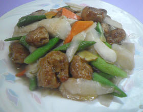 - 4. 锅中少许油,依序爆香姜片、红萝卜、笋片,加一碗水略煮,续下素肉块拌炒,后下秋葵拌匀,加胡椒粉滴几滴香油即可起锅。