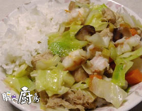 选用任何材料悉随尊便,但要以少肉多菜为主!今次配料选用虾粒、椰菜、素肉、红萝卜、冬菇。