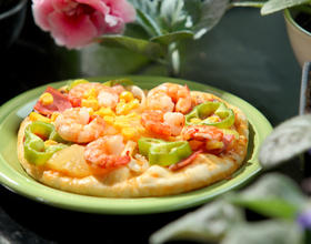 - 5. 用刷子涂上意大利面酱,铺满起司丝,再均匀洒上凤梨片、玉米粒、火腿片和虾仁、青椒与洋葱。