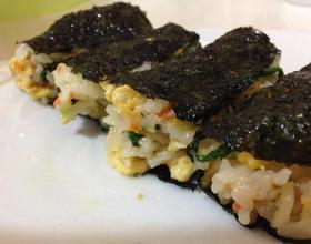 绞肉稍微炒香后加葱丁及红萝卜丁继续拌炒,之后加入青菜,待青菜熟后倒入碎蛋和白饭拌匀