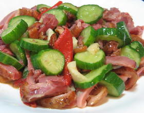锅热油热蒜头爆香,小黄瓜片下锅炒8分熟。