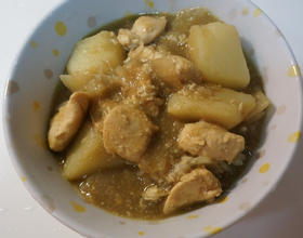 大火煮滚后转小火煮约半小时,确认马铃薯炖软后,再加入半盒(六片)咖哩块,边煮边搅拌至咖哩块融化即可。