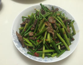 将蒜苔加进去拌炒到要起锅前加点盐巴就完成